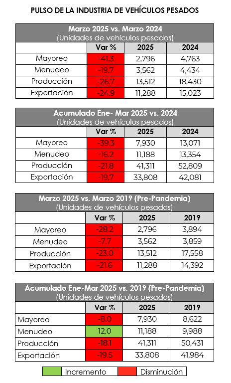 Al abordar los resultados en ventas al mayoreo correspondientes a marzo y al acumulado del primer trimestre del año, el presidente de la asociación detalló que, durante marzo, se comercializaron 2,796 unidades, lo que representa una caída de 41.3% respecto al mismo mes de 2024. En tanto, en el acumulado de enero a marzo, la venta de vehículos pesados suma 7,930 unidades, cifra 39.3% menor frente a las 13,071 colocadas en igual periodo del año pasado.